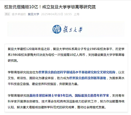 復(fù)旦大學(xué)獲校友一次性捐贈10億元!還有哪些高校曾獲該級別校友捐贈?
