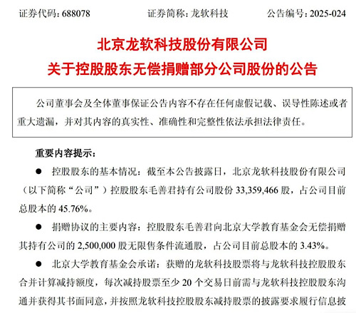市值約7725萬元!龍軟科技控股股東向北京大學(xué)捐贈250萬股公司股份