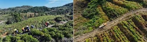 永順縣發(fā)樹(shù)村莓茶園采茶后運(yùn)輸場(chǎng)景(左:人工,右:小火車(chē))