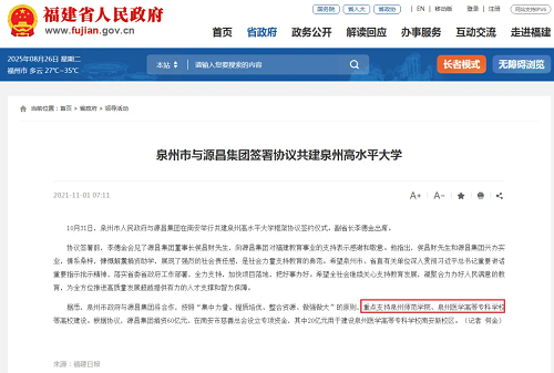 源昌集團微信公眾號文章稱,此舉是“為創(chuàng)建泉州醫(yī)學院的目標做準備,目標是建成一所高水平的泉州醫(yī)科大學”。