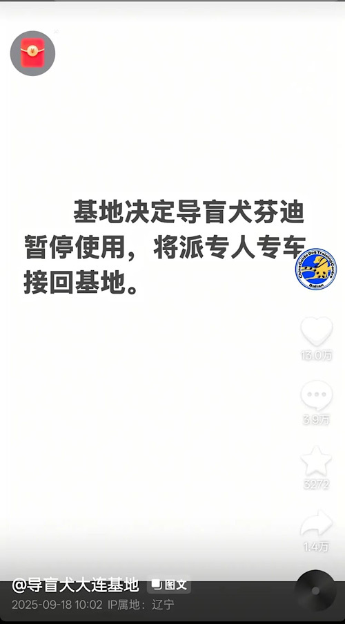 大連導盲犬訓練基地抖音官方賬號發(fā)布