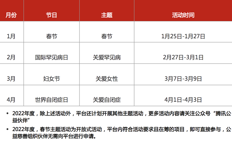 2022年,騰訊公益平臺(tái)將在每個(gè)月份開(kāi)放一場(chǎng)“主題小紅花日配捐活動(dòng)”,將溫暖延伸到全年。每場(chǎng)主題小紅花配捐活動(dòng),騰訊公益慈善基金會(huì)都將提供配捐。一季度的小紅花主題日配捐活動(dòng)已經(jīng)出爐,分別是“新春小紅花日”、“關(guān)愛(ài)罕見(jiàn)病小紅花日”、“關(guān)愛(ài)女性小紅花日”和“關(guān)愛(ài)自閉癥小紅花日”。主題日的立意更多是希望能夠讓大家關(guān)注到這些議題,去幫助有需要的人群,也希望可以通過(guò)主題日的方式讓更多小眾的好項(xiàng)目被看見(jiàn)。