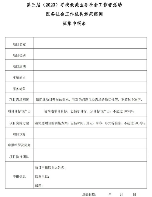 (點擊鏈接http://www.cieahugc.cn/files/2023/04/747923088217443f9d988ae3ff3abea0.docx下載第三屆(2023)尋找最美醫(yī)務(wù)社會工作者案例征集申報表)