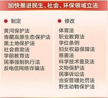 制定黃河保護(hù)法、青藏高原生態(tài)保護(hù)法、黑土地保護(hù)法、社會(huì)救助法、學(xué)前教育法、民事強(qiáng)制執(zhí)行法、反電信網(wǎng)絡(luò)詐騙法,修改體育法、職業(yè)教育法、學(xué)位條例、婦女權(quán)益保障法、慈善法、科學(xué)技術(shù)普及法、文物保護(hù)法、民事訴訟法、治安管理處罰法、野生動(dòng)物保護(hù)法。